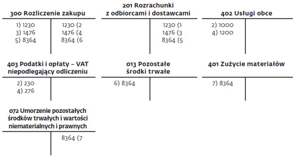 W przypadku zakupu środków trwałych podlegających umorzeniu w czasie ich nabycie nie będzie stanowić kosztu – będą ujmowane na koncie 011 Środki trwałe, a ich amortyzacja będzie obciążała konto 400 Amortyzacja. Natomiast w przypadku zakupu niskocennego sprzętu podlegającego jednorazowemu umorzeniu będzie on ujmowany na koncie 013 Pozostałe środki trwałe. Natomiast jednorazowy odpis amortyzacyjny będzie ujmowany zapisem: