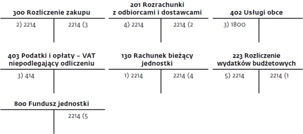 Gmina będzie zlecać wypłatę świadczeń gminnemu ośrodkowi pomocy społecznej. W celu realizacji świadczeń podjęto decyzję o wyremontowaniu pomieszczenia GOPS za 1800 zł + 414 zł VAT. W związku z powyższymi zdarzeniami w GOPS zaistnieją następujące operacje gospodarcze: