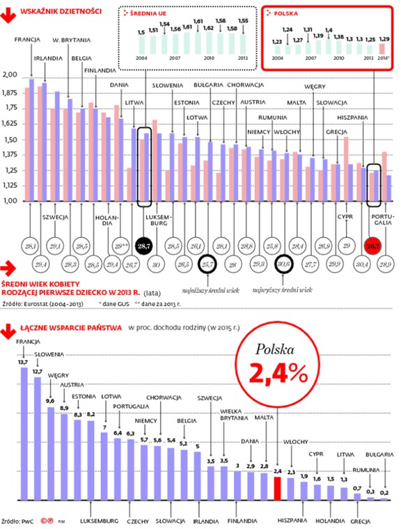 Podstawowym czynnikiem odpowiedzialnym za ten stan rzeczy jest oczywiście niska dzietność. – Coraz mniej Polek zostaje matkami. Wśród kobiet urodzonych w 1970 r. około 17 proc. nie ma dziecka, gdy wśród kobiet urodzonych w latach 1945–1955 odsetek ten wynosił 8 proc. – wyjaśnia Monika Mynarska, demograf ze Szkoły Głównej Handlowej. Polska nie jest wyjątkiem; kraje rozwinięte zmagają się ze spadającą dzietnością od lat 80. Każde państwo stosuje własny koktajl rozwiązań – od zasiłków przez urlopy wychowawcze po reformę systemu podatkowego. Można je dzięki temu pogrupować na cztery wielkie rodziny: skandynawską, kontynentalną, anglosaską oraz śródziemnomorską.