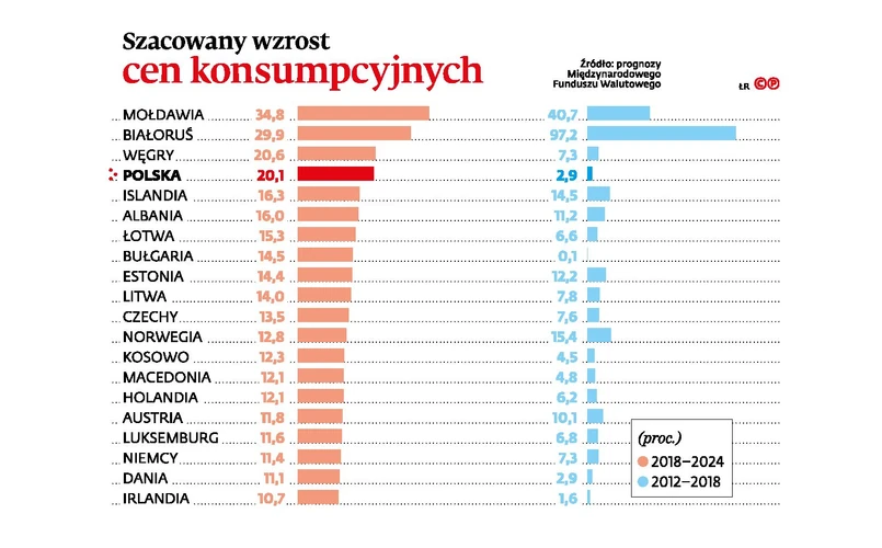 W najbliższych czterech latach średnioroczna inflacja w Polsce będzie przekraczać 3 proc. – wynika z najnowszych prognoz Międzynarodowego Funduszu Walutowego. Dopiero w 2024 r. inflacja spadnie poniżej tego poziomu i wyniesie 2,8 proc. Z miesiąca na miesiąc nie oznacza to dotkliwych podwyżek cen. W sumie jednak będzie skutkowało wzrostem ich poziomu – w porównaniu z 2018 r. – o jedną piątą. Mówiąc obrazowo – koszyk towarów i usług, który w ub.r. był wart 500 zł, za pięć lat będzie kosztować już 600 zł. Wzrost płac powinien z nadwyżką skompensować inflację. Inaczej będzie w przypadku świadczeń takich, jak 500 plus, które nie są w żaden sposób powiązane ze wzrostem cen.
