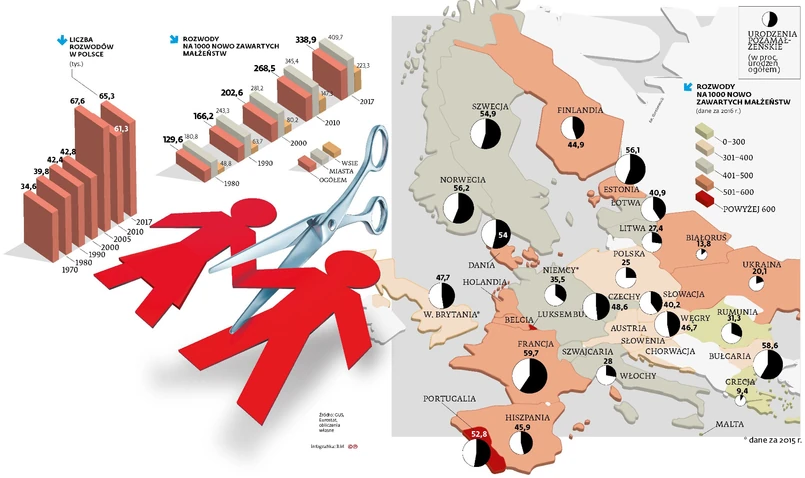 Wzorem krajów skandynawskich z lat 70. i 80. wiele osób wstępujących w związek małżeński przyjeżdża na ślub z wózkiem. Dzieci ostatecznie lądują w rodzinie, gdzie mama i tata sformalizowali swoje relacje – i z potomstwa pozamałżeńskiego stają się przedmałżeńskim. Jednak sam wzrost takich urodzeń sugeruje, że coś się dzieje. W ciągu dekady podniósł się też o dwa lata średni wiek formowania rodziny. Dla kobiety to 26 lat, dla mężczyzny – 28. Systematycznie rośnie też akceptacja dla życia w związkach nieformalnych. Dołóżmy do tego rozwody – ciągle na poziomie 30 proc., spadający udział małżeństw wyznaniowych – o 10 pkt proc. w stosunku do 2004 r., i wzrost małżeństw powtórnych.