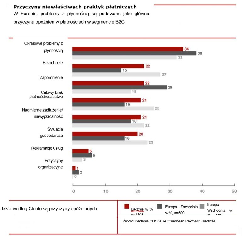 U 34% badanych najczęściej podawaną przyczyną niewłaściwych praktyk płatniczych są okresowe kłopoty, za którymi kryje się bezrobocie (22%) oraz sytuacja ekonomiczna (20%). Innym powodem (22%) opóźnionych płatności jest przekonanie, że kontrahenci po prostu zapominają płacić swoje rachunki.