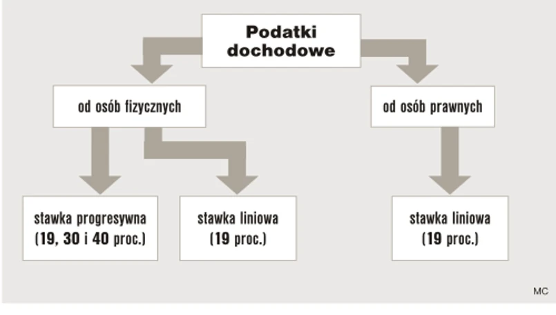 W Polsce występuje podatek dochodowy od osób fizycznych, którego zasady rozliczania określają przepisy ustawy o podatku dochodowym od osób fizycznych (ustawa o PIT), oraz podatek dochodowy od osób prawnych, którego rozliczanie oparte jest na przepisach ustawy o podatku dochodowym od osób prawnych (ustawa o CIT). Podatek dochodowy od osób fizycznych, czyli dotyczący np. przedsiębiorców, emerytów i rencistów, zatrudnionych na umowę o pracę, zlecenia czy o dzieło, płacony jest według stawki progresywnej. Jest też możliwość wyboru opłacania podatku według 19-proc. stawki liniowej. Z takiej możliwości mogą skorzystać tylko przedsiębiorcy.