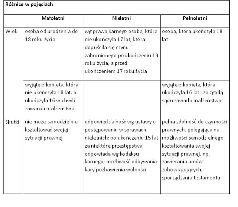 Jest to osoba fizyczna, która nie ukończyła jeszcze 18 lat. Pełnoletność uzyskuje w dniu, w którym ukończyła 18 lat, albo w którym zawarła małżeństwo. Nie traci jej nawet w razie unieważnienia małżeństwa. Dopiero z chwilą uzyskania pełnoletności nabywa się pełną zdolność do czynności prawnych.