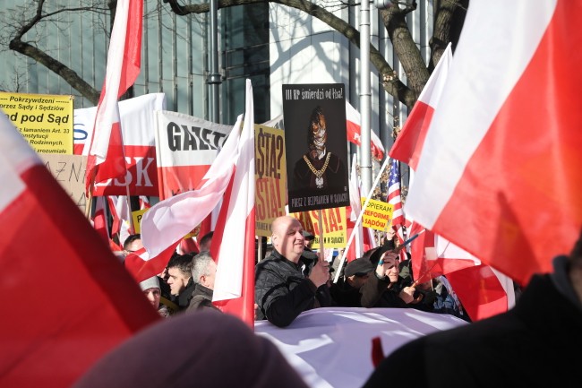 22 Na transparentach, które trzymali uczestnicy demonstracji widniały napisy: "Kasta? Basta. Precz z bezprawiem w sądach", "Sądy i prokuratura w ręce suwerena", "Fałszywe sądy, złodziejskie rządy", "Stop sądokracji", "Kasta do kasacji, usunąć z zawodu przestępców w togach", "Kasta do pełnej lustracji"