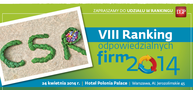 Ranking odpowiedzialnych firm 2014 to ósma edycja jedynego i całościowego zestawienia największych spółek w Polsce ocenianych pod kątem jakości zarządzania społeczną odpowiedzialnością biznesu. Kolejne organizowane przez nas spotkanie pozwala przypuszczać, że CSR nie jest przemijającą modą, ale trwałym składnikiem systemów zarządzania. Wciąż bowiem rośnie liczba firm, które poddają całościowej ocenie swoje strategie, procedury i wyniki dotyczące CSR. Gala, podczas której zaprezentujemy ranking za rok 2013 odbędzie się 24 kwietnia w Hotelu Polonia w Warszawie.
