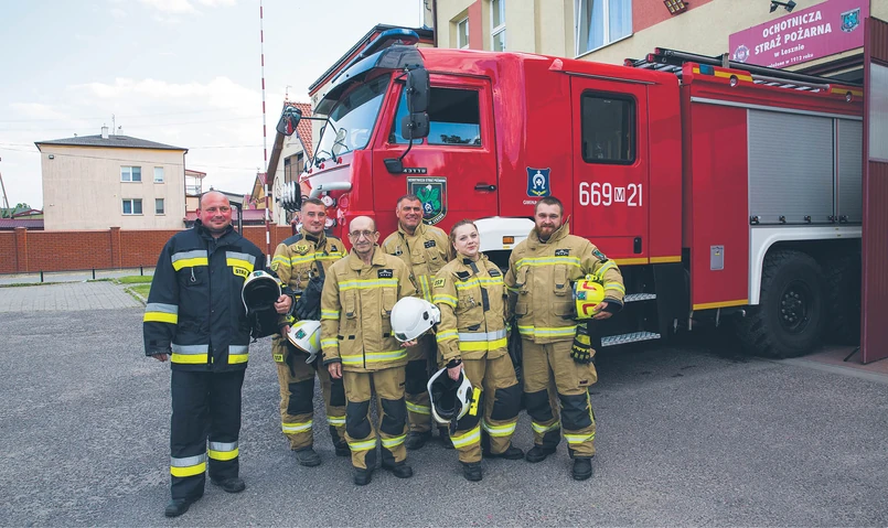 Pełna obsada wozu to sześciu strażaków. Ale nie ma grafików i gwarancji, ilu ludzi dobiegnie. – Bywało, że jechaliśmy we dwóch. Gdy paliły się nieużytki, najpierw rozwijaliśmy jedną linię do rozdzielacza, potem drugą. I gasiliśmy – mówi druh Sławomir, wskazując na druha Stanisława Filankiewicza, prezesa OSP w Lesznie.