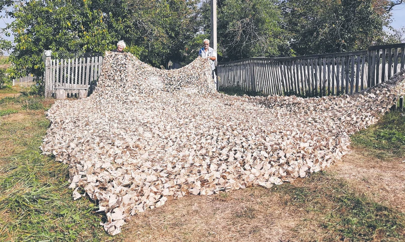 Podstawą jest polietylenowa siatka podobna do rybackiej (albo po prostu rybacka), którą potocznie nazywa się właśnie tak: osnową, czyli podstawą. Iryna tłumaczy, że wcześniej brali taką z linką o grubości 0,7–0,8 mm i oczkami 4 na 4 cm, ale ostatnio znaleźli lepszą, wytrzymalszą, której linki mają 1,2 mm grubości i oczka 5 na 5 cm. Na nią nawleka się ciętą w choinkę włókninę typu spunbond w barwach ochronnych – zielonych na lato i białawych na zimę. W cięciu spunbondu specjalizuje się mąż Iryny. W normalnych czasach z takiej włókniny robi się np. fartuchy ochronne dla pracujących w przemyśle albo pokrywa się nią materace. Na wojnie pomagają kamuflować pozycje. Siatki rodziny Sydorenków trafiają głównie na wschód. Iryna oglądała test bojowy na ekranie telewizora. Gdy jedna z ekip TV przygotowywała reportaż z frontu, nadleciały rosyjskie drony zwiadowcze. Żołnierze i reporterzy ukryli się pod jej siatkami. Bezzałogowiec niczego nie zauważył. – No, duma była – kwituje z uśmiechem emerytka.