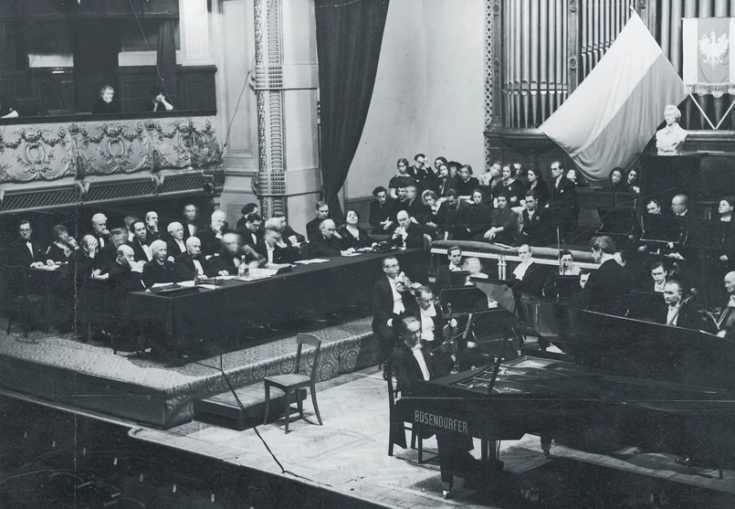 Cóż znaczą jednak rozkopane ulice wobec ruin? W 1949 r. – po 12-letniej przerwie spowodowanej wojną – równo w sto lat po śmierci Chopina zdecydowano o reaktywacji konkursu nie w Krakowie, gdzie wówczas toczyło się życie muzyczne, lecz w odradzającej się z gruzów Warszawie. Nie w gmachu filharmonii, ale w jej tymczasowej siedzibie – sali Roma (dziś jest teatrem musicalowym). Dlaczego? „IV Konkurs miał bowiem odegrać rolę kulminacyjnej ceremonii w konsekracji Chopina jako patrona socjalistycznej polityki kulturalnej (…). Zamiast walczyć z Chopinem przedwojennym, dokonano zatem przechwycenia, przesuwając akcenty w interpretacji jego twórczości i biografii” – pisze Ada Arendt. Rozmach, z jakim świętowano stulecie śmierci kompozytora, odpowiadał potrzebie legitymizacji władz PRL w oczach zachodniego świata. Zagrano ponad 2 tys. koncertów dla więcej niż miliona odbiorców (drugie tyle słuchało przez radio). Rok Chopinowski uświetniły wydarzenia nie tylko w kraju, lecz również za granicą, m.in. w Moskwie, Wiedniu, Londynie, Paryżu. „Wielki koncert w Carnegie Hall pod egidą Narodów Zjednoczonych, tłumy, loże z flagami 39 narodów” – relacjonował z Nowego Jorku Czesław Miłosz, wówczas polski attaché kulturalny w USA. Nie ominięto krajów mniej oczywistych dla polskiej polityki kulturalnej, np. Brazylii, Meksyku, Izraela czy Kanady.