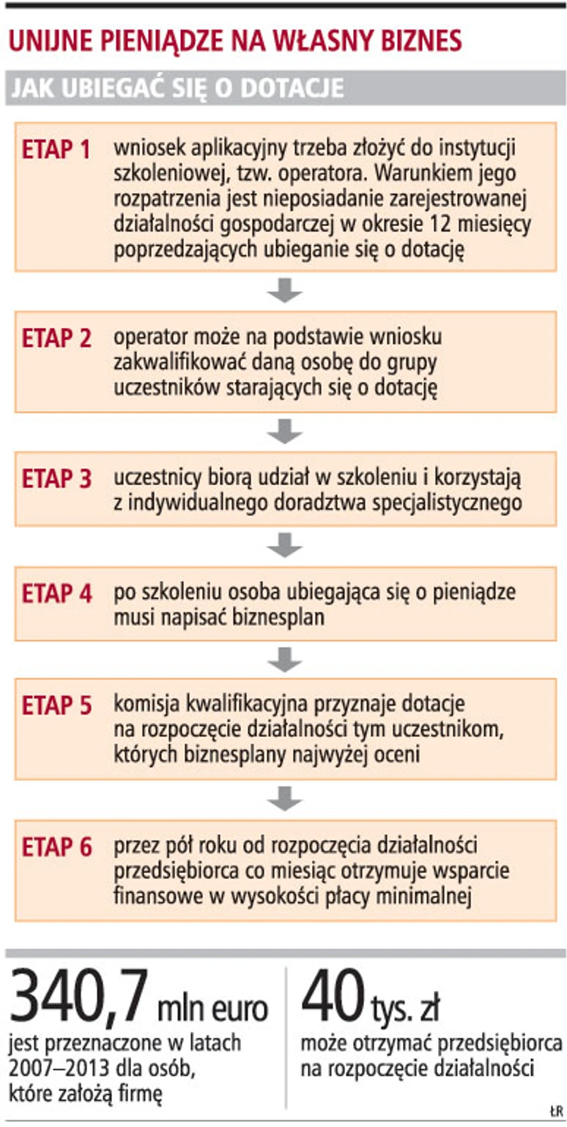Osoba, która chce uzyskać dotację, musi zgłosić swój udział w projekcie realizowanym przez instytucję - tzw. operatorów - która otrzymała na ten cel środki unijne z wojewódzkiego urzędu pracy lub urzędu marszałkowskiego. Operatorzy, zanim otrzymają pieniądze, muszą wziąć udział w konkursie zorganizowanym przez WUP lub urząd marszałkowski. Takie konkursy zostały już ogłoszone we wszystkich województwach.