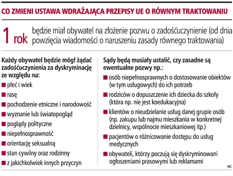 Obywatele, którzy uznają że dyskryminuje ich np. promocja handlowa, reklama, ogłoszenie w prasie (np. w sprawie pracy), odmowa najmu mieszkania, zasady rekrutacji do szkół lub dostępu do opieki medycznej, będą mieli podstawę prawną do żądania zaniechania takich działań lub zadośćuczynienia. Tak wynika z przygotowanego przez resort pracy projektu ustawy w sprawie wdrożenia niektórych przepisów Unii Europejskiej w zakresie równego traktowania. Opiniował go już Komitet Rady Ministrów, dlatego wkrótce powinien zostać skierowany pod obrady rządu.