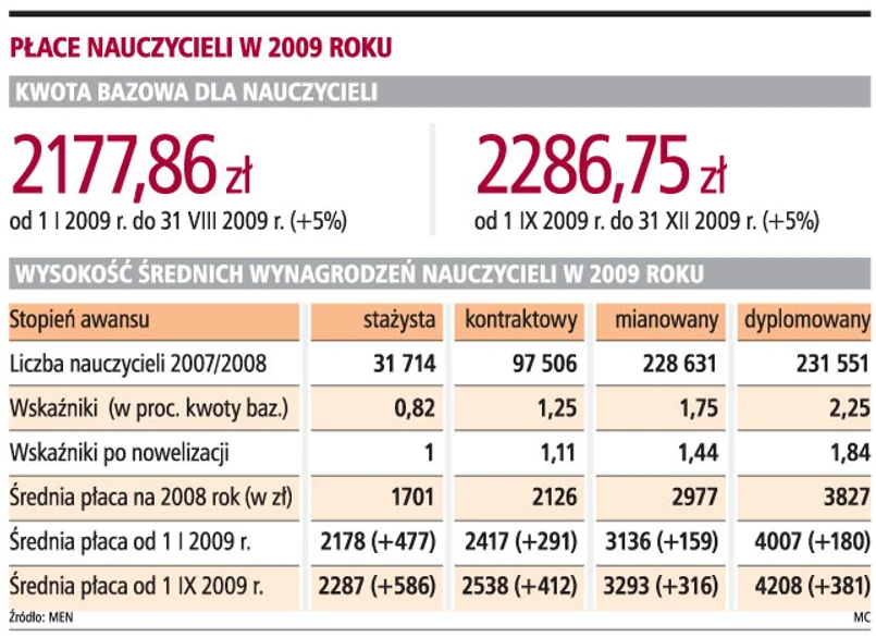 Wysokość minimalnych stawek wynagrodzenia zasadniczego nauczycieli określa minister edukacji w rozporządzeniu. Ostateczna wysokość płacy nauczyciela zależy od gmin. To one określają co roku w regulaminie m.in. wysokość dodatków czy warunki wypłacania dodatkowych składników wynagrodzenia dla nauczycieli posiadających określony stopień awansu zawodowego. Jednak wysokość tzw. średnich płac (mają uwzględniać wszystkie składniki) nauczycieli jest określona w ustawie. Gminy powinny więc sugerować się ich wysokością.
