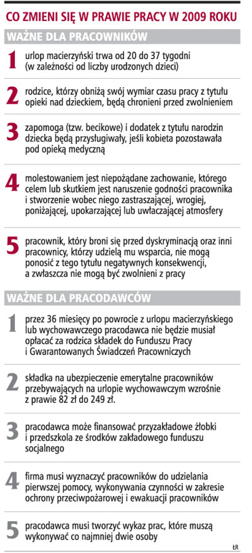 Od 1 stycznia 2009 r. wymiar urlopu macierzyńskiego został wydłużony z 18 do 20 tygodni (w przypadku urodzenia jednego dziecka). Tylko w określonych w kodeksie pracy przypadkach pracodawca będzie mógł zwolnić pracownika, który obniżył wymiar swojego czasu pracy ze względu na opiekę nad dzieckiem. To jedne z najważniejszych uprawnień, jakie w 2009 r. zyskają pracownicy. Pracodawcom z kolei przybędą w tym roku nie tylko prawa, jak np. zwolnienie z konieczności opłacania niektórych składek za rodziców, ale także dodatkowe obowiązki.