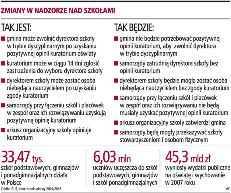 Zdaniem Ministerstwa Edukacji Narodowej, które przygotowało projekt nowelizacji ustawy z 7 września 1991 r. o systemie oświaty (t.j. Dz.U. z 2004 r. nr 256, poz. 2572 z późn. zm.) uporządkuje on zakres odpowiedzialności i kompetencji dyrektorów szkół, nadzoru pedagogicznego i samorządów. Rząd chce, aby gmina zatrudniając dyrektora szkoły, nie musiała zasięgać opinii kuratorium. Jego rola ma się ograniczyć do zasiadania w komisji konkursowej. Od kuratora nie będzie też już wymagana pozytywna opinia, jeśli gmina będzie odwoływać bez wypowiedzenia ze stanowiska dyrektora szkoły w czasie roku szkolnego.