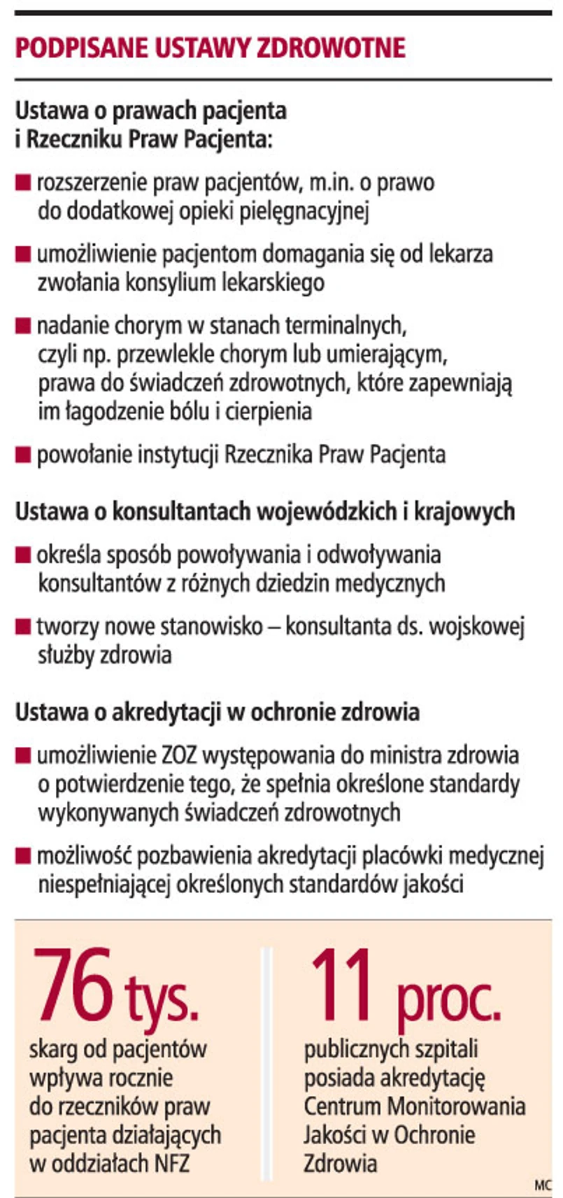 Brak publikacji ustaw zdrowotnych podpisanych przez prezydenta to przede wszystkim zła informacja dla pacjentów. Niewejście w życie przepisów ustawy o prawach pacjenta pozbawia ich nowych przywilejów. Od tego roku ich katalog miał być poszerzony.