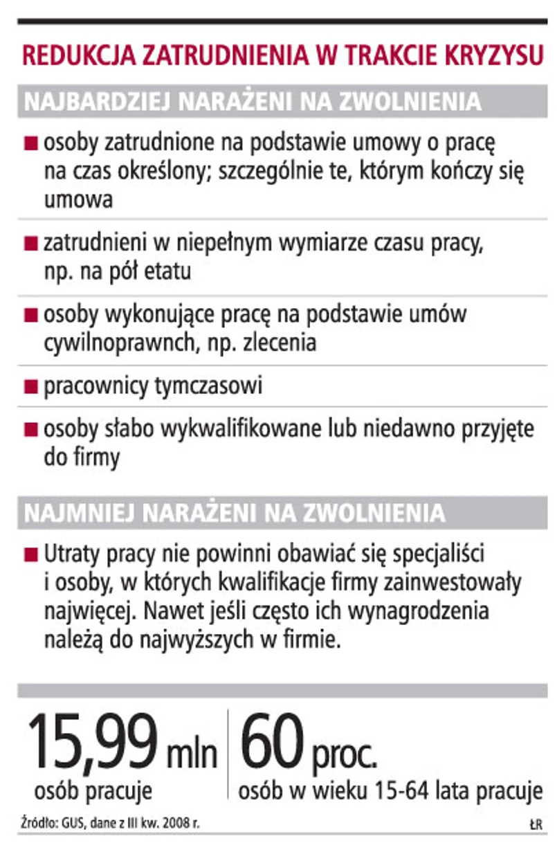 Firmy będą pozbywać się najlepiej wykwalifikowanych i wynagradzanych pracowników dopiero w ostateczności. Najbardziej narażone na zwolnienie są osoby, którym kończy się umowa na czas określony. Firmy w poszukiwaniu oszczędności ograniczą wydatki na usługi outsourcingowe.