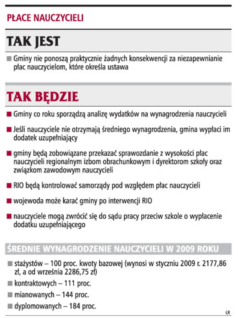 Gminy dowolnie wyliczają poziom średnich płac nauczycieli, bo nie mają jasnych przepisów w tej sprawie. Od tego roku gminom, po kontrolach regionalnych izb obrachunkowych, grożą kary za zaniżanie płac pedagogów. Nauczyciele stażyści i kontraktowi mogą pozywać do sądu dyrektorów szkół za zaniżanie wynagrodzenia.