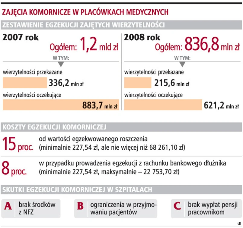 Zajęcia komornicze w placówkach medycznych uniemożliwiają przyjmowanie pacjentów i wypłaty pensji pracownikom. W 2008 roku komornicy ściągnęli od szpitali ponad 215 mln zł wierzytelności, a 621 mln zł mają jeszcze wyegzekwować. Samorząd lekarski domaga się uzależnienia prowizji komorniczych od faktycznych nakładów ich pracy w ściąganiu długu.