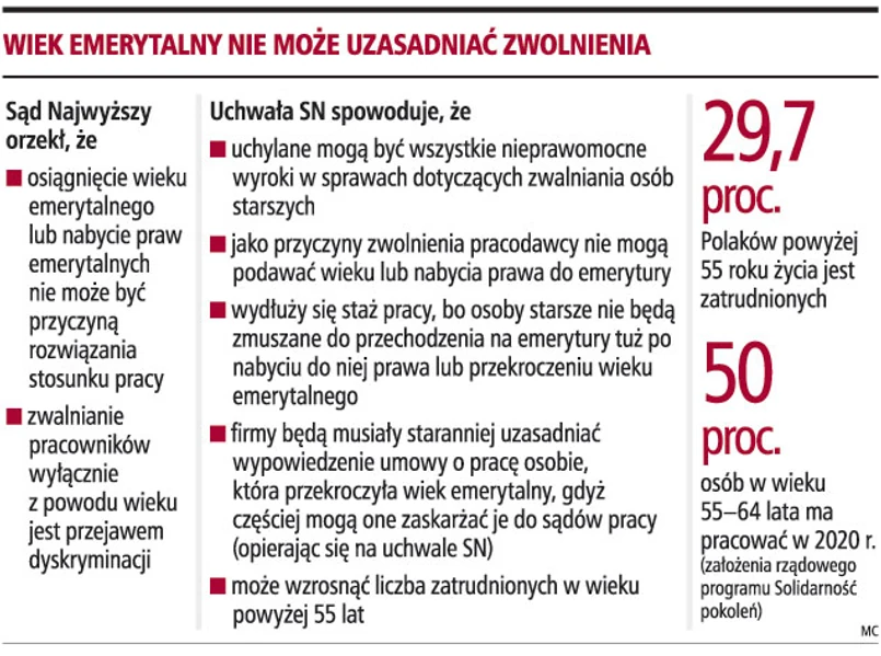 Osiągnięcie wieku emerytalnego i nabycie prawa do emerytury nie może być wyłączną przyczyną zwolnienia. Sądy mogą uchylać nieprawomocne wyroki w sprawach dotyczących zwolnień starszych pracowników. Wzrośnie liczba zatrudnionych kobiet powyżej 60 roku życia i mężczyzn, którzy mają ponad 65 lat.