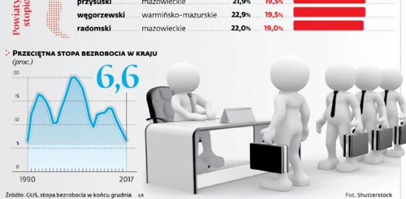 Jest i drugi biegun, a na nim 36 powiatów, w których stopa bezrobocia wciąż jest wyższa niż 15 proc. Na czele z powiatem szydłowieckim – jedynym, w którym ten odsetek przekracza jedną czwartą aktywnych zawodowo. Liczba takich powiatów jest jednak dwukrotnie mniejsza niż w roku poprzednim.