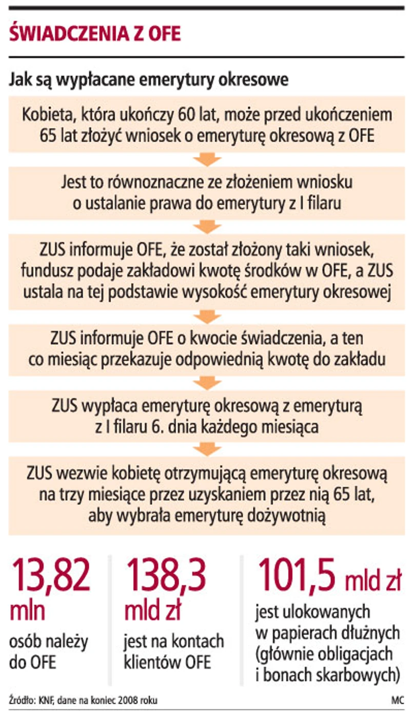 Grzegorz Chłopek, wiceprezes ING Powszechnego Towarzystwa Emerytalnego, ocenia, że w ING OFE prawo do emerytur okresowych może mieć w tym roku około 500 kobiet. Dodaje, że najwyższy kapitał zgromadzony dla kobiety z 1949 roku w tym funduszu wynosi 70 tys. zł.