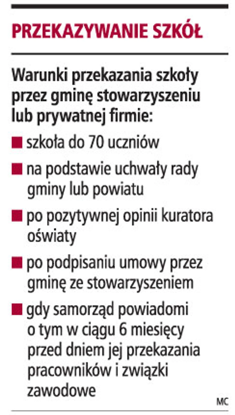 Nowelizacja ustawy wprowadza też możliwość przekazywania przez samorządy małych szkół liczących nie więcej niż 70 uczniów stowarzyszeniom rodziców lub prywatnym firmom. Aby placówka mogła być przekazania, niezbędna będzie pozytywna opinia kuratora oświaty. Przejęcie szkoły np. przez rodziców spowoduje, że gmina nie będzie musiała likwidować jej, jeśli nie ma na to środków.
