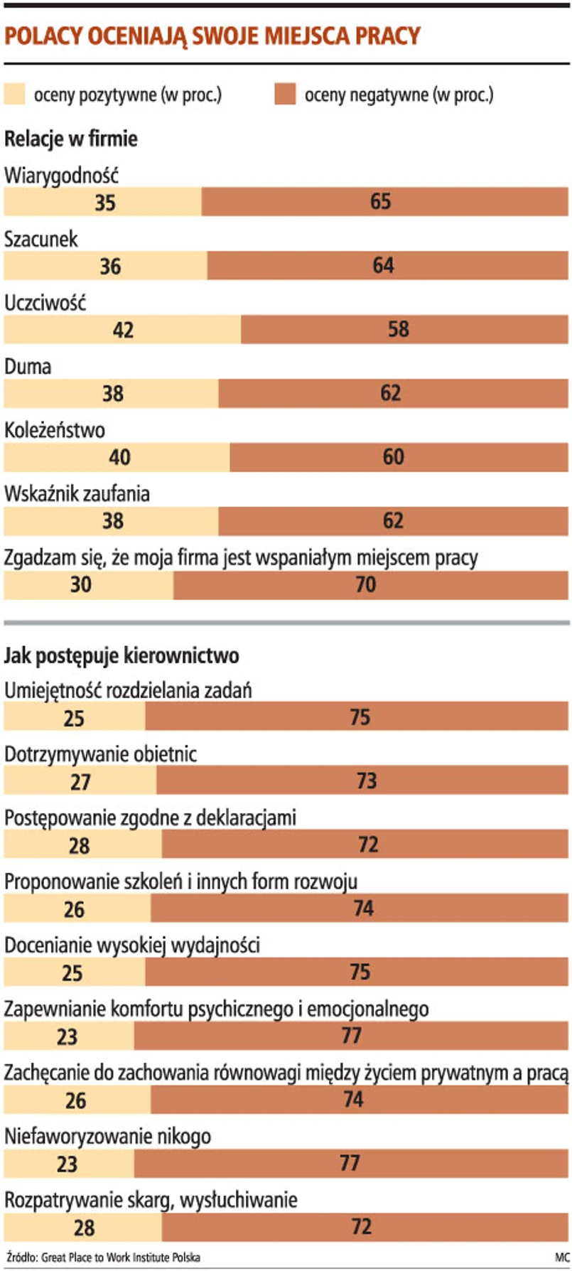 W opinii badanych miejsca pracy, w których są oni zatrudnieni, dalekie są od miana wspaniałych. Na pytania dotyczące tego: czy ufają oni ludziom, dla których pracują, czy są dumni z tego, co robią, a także czy lubią swoich kolegów z pracy, pozytywnej odpowiedzi udzieliło zaledwie 35-42 proc. ankietowanych. Dla porównania wyniki w najlepszych firmach na całym świecie wynoszą przynajmniej 60 proc.