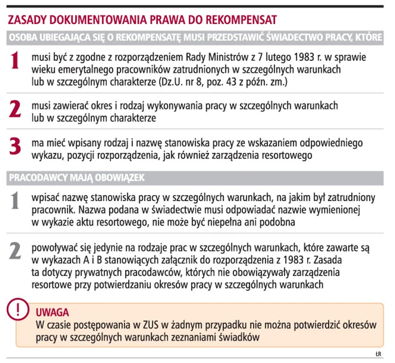 Dlatego pracownicy wykonujący prace, które przed 1 stycznia 2009 r. uprawniały do wcześniejszej emerytury, muszą mieć świadectwa pracy potwierdzające okresy pracy na takich stanowiskach. Z tym jednak mogą mieć problem. Według Jolanty Louchin, dyrektora Archiwum Państwowego Dokumentacji Osobowej i Płacowej w Milanówku, część takich firm już nie istnieje. Z każdym rokiem coraz trudniej będzie odszukać dokumentację osobową i płacową, na podstawie której ZUS ustali wysokość nie tylko przyszłej emerytury, ale także kapitału początkowego i rekompensaty.