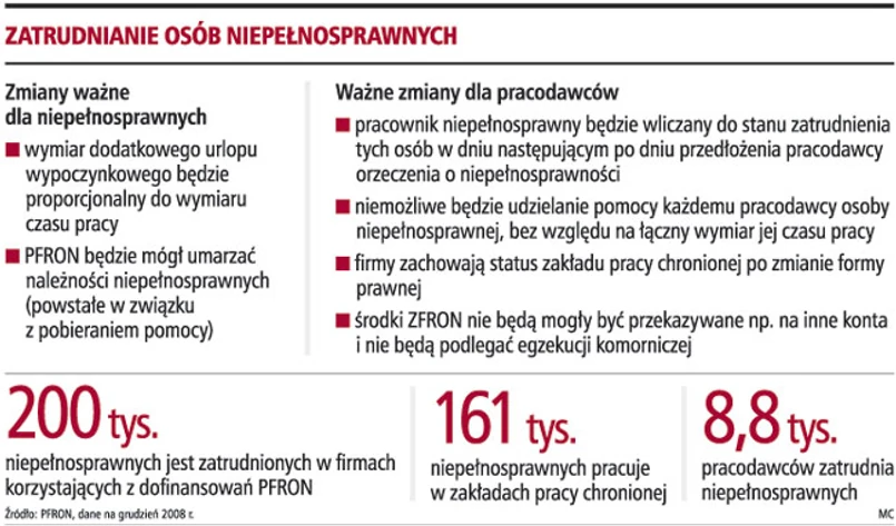 Najwięcej proponowanych zmian dotyczy pracodawców niepełnosprawnych. Wprowadzony ma być przepis uniemożliwiający udzielenie dofinansowania do wynagrodzenia niepełnosprawnego zatrudnionego u różnych pracodawców w wymiarze przekraczającym pełny wymiar czasu pracy. Zdaniem resortu pracy obecnie możliwe jest udzielenie każdemu pracodawcy pomocy w formie dofinansowania do wynagrodzenia tego samego pracownika - niezależnie od tego, ile wynosi jego łączny wymiar czasu pracy u wszystkich pracodawców. W styczniu GP skierowała zapytanie do Biura Pełnomocnika Rządu ds. Osób Niepełnosprawnych w tej sprawie. Biuro uznało, że w takich przypadkach dofinansowanie przysługuje pracodawcom w wysokości proporcjonalnej do wymiaru czasu pracy, ale nieprzekraczającej jej pełnego wymiaru czasu pracy. Resort w założeniach zmienił więc swoją opinię.