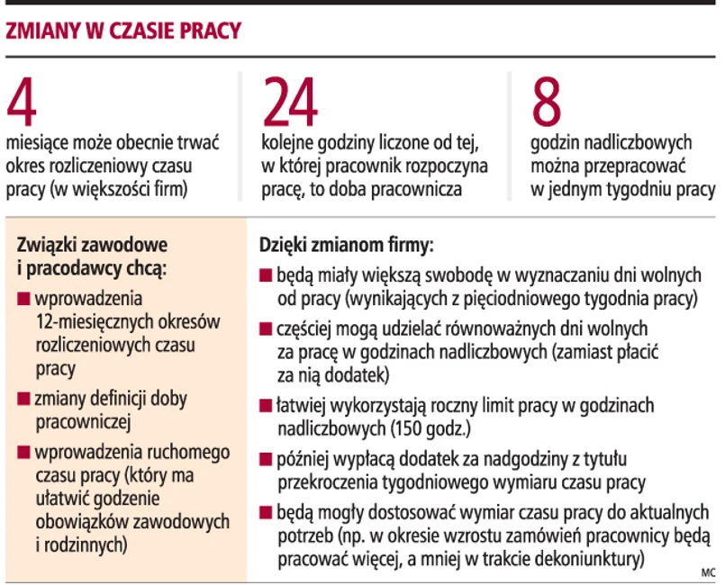 Pracodawcy i związkowcy zgodzili się także na racjonalizację przepisów dotyczących doby pracowniczej. Mechanizm doby pracowniczej określony w art. 128 par. 3 pkt 1 k.p. polega na tym, że doby takie rozpoczynać się mogą jedynie po zamknięciu poprzednich, czyli po 24 godzinach od chwili rozpoczęcia pracy dzień wcześniej. Jeżeli zatem pracownik rozpoczyna pracę o ósmej we wtorek, pracę w środę powinien rozpocząć nie wcześniej niż o godzinie ósmej. Rozpoczęcie pracy przed tą godziną oznaczać może pracę w godzinach nadliczbowych z powodu przekroczenia dobowej normy czasu pracy.