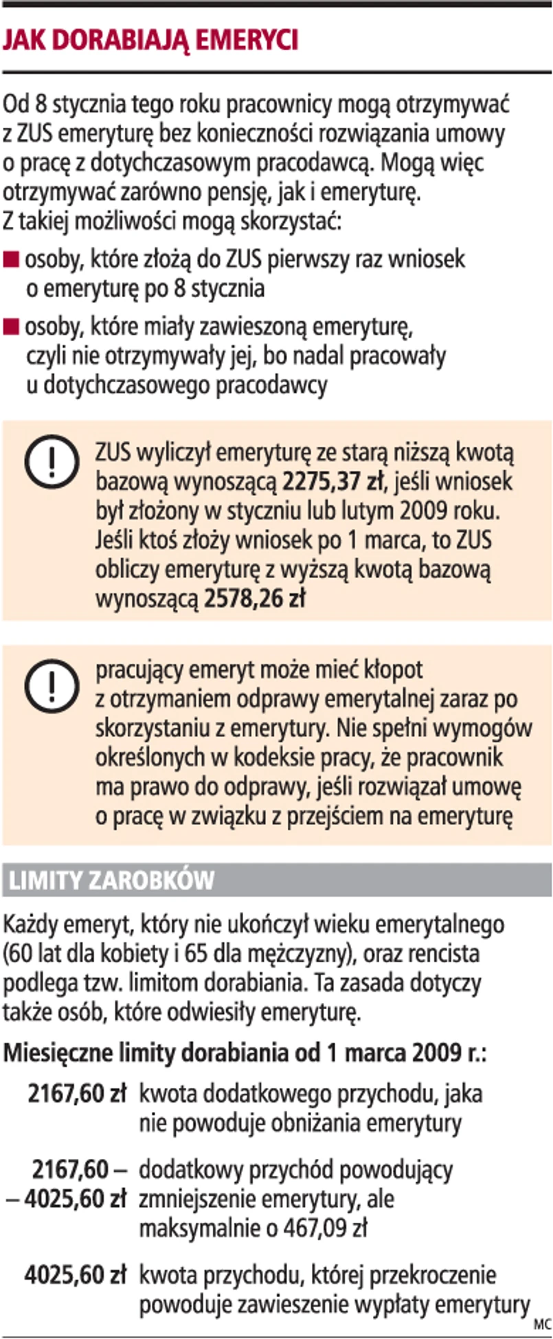 20 tys. pracowników złożyło od stycznia 2009 r. wniosek o odwieszenie emerytury. Emeryt, który nie ukończył wieku emerytalnego i dorobi więcej niż 4025,60 zł miesięcznie, ma zawieszane świadczenie. W Sejmie na rozpatrzenie czeka projekt ustawy znoszący limity dorabiania dla emerytów.