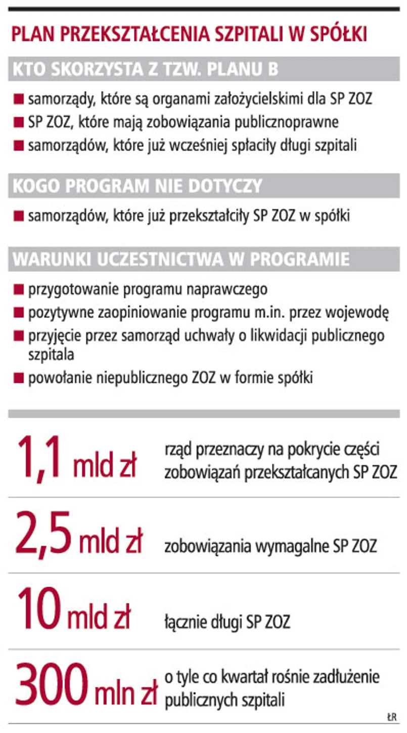 Do połowy kwietnia resort zdrowia zamierza przedstawić ostateczną wersję planu B. Zgodnie z projektem uchwały w tej sprawie z programu skorzystają tylko te samorządy, których szpitale posiadają zobowiązania wymagalne wobec ZUS czy fiskusa. Resort zdrowia zapowiada jednak rozszerzenie kręgu podmiotów, które zostaną objęte programem.