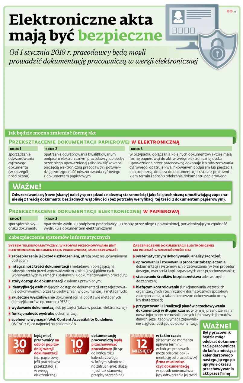 Wynika z niego, że dokument w postaci elektronicznej musi posiadać dwie najistotniejsze cechy, tj. zapewniać autentyczność pochodzenia, czyli możliwość identyfikacji osoby dokonującej wpisu do akt, oraz zachować integralność treści dokumentacji. Pracodawca będzie musiał zatem zagwarantować, że w treści elektronicznych akt nie będzie można zmienić danych dotyczących nawiązywania, przebiegu i rozwiązania stosunku pracy (poza sytuacjami, gdy jest to konieczne i realizowane w ramach procedur, które są odnotowywane). Ma to ochronić dokumentację przed ingerencją osób trzecich, która mogłaby mieć negatywne konsekwencje nawet w bardzo długiej perspektywie czasowej (np. na etapie ustalania uprawnień emerytalnych).