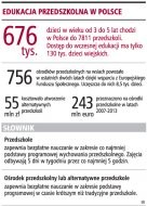 Pozwoliłoby to na znaczne upowszechnienie edukacji przedszkolnej. Z najnowszych danych GUS wynika bowiem, że w roku szkolnym 2006/2007 do prawie 8 tys. przedszkoli chodziło tylko 41 proc. dzieci w wieku od trzech do pięciu lat.