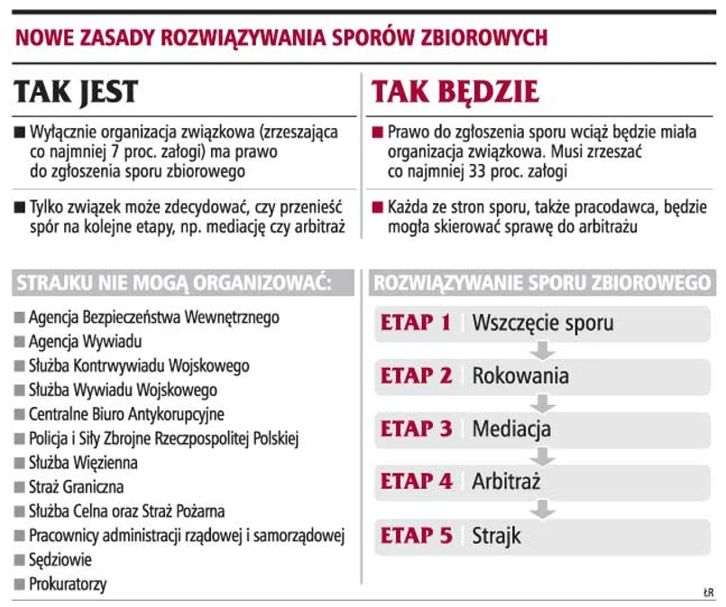 Pracodawcy przedstawią jutro w Komisji Trójstronnej własne propozycje zmian w sposobie rozwiązywania sporów zbiorowych. Strajkujący pracownicy nie będą mogli okupować przedsiębiorstw, blokować bram, dróg, urządzeń i firmowych budynków. Związki zawodowe, choć uznają zasadność zmian, nie zgadzają się na drastyczne ograniczanie ich roli.