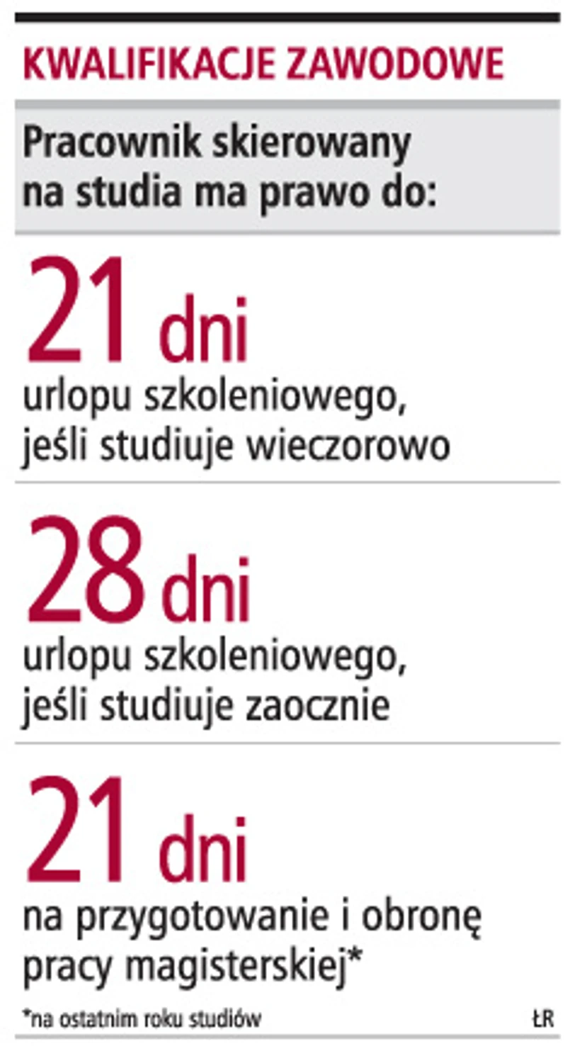 Pracownikowi, który został skierowany na studia, przysługuje 21 lub 28 dni płatnego urlopu szkoleniowego w każdym roku nauki, które ma on przeznaczyć na udział w obowiązkowych zajęciach oraz przygotowanie się i przystąpienie do egzaminów. Jeśli zwolni się z pracy w ciągu trzech lat od momentu ukończenia nauki, musi zwrócić pracodawcy część kosztów, jakie ten poniósł w związku z podwyższeniem kwalifikacji zawodowych podwładnego.