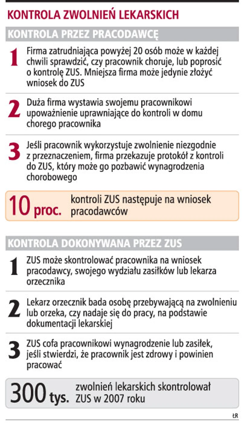 W ubiegłym roku ZUS uznał, że co dziesiąta osoba przebywająca na zwolnieniu lekarskim nadaje się do pracy. Sprawdził około 300 tys. zwolnień z ogólnej liczby 1,7 mln i cofnął wypłatę świadczeń chorobowych na kwotę około 80 mln zł. Można więc przyjąć, że gdyby skontrolował wszystkie