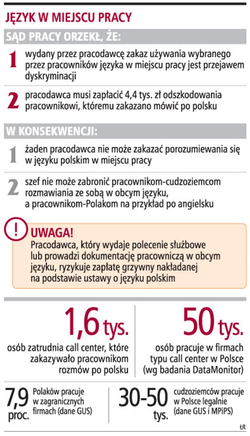 Szef musi wydawać polecenia oraz prowadzić dokumentację pracowniczą w języku polskim. Pracodawcy łamiący zasadę używania polskiego w stosunkach pracy mogą zapłacić grzywnę i odszkodowanie. Nie można zakazać pracownikom porozumiewania się między sobą w jakimkolwiek języku.