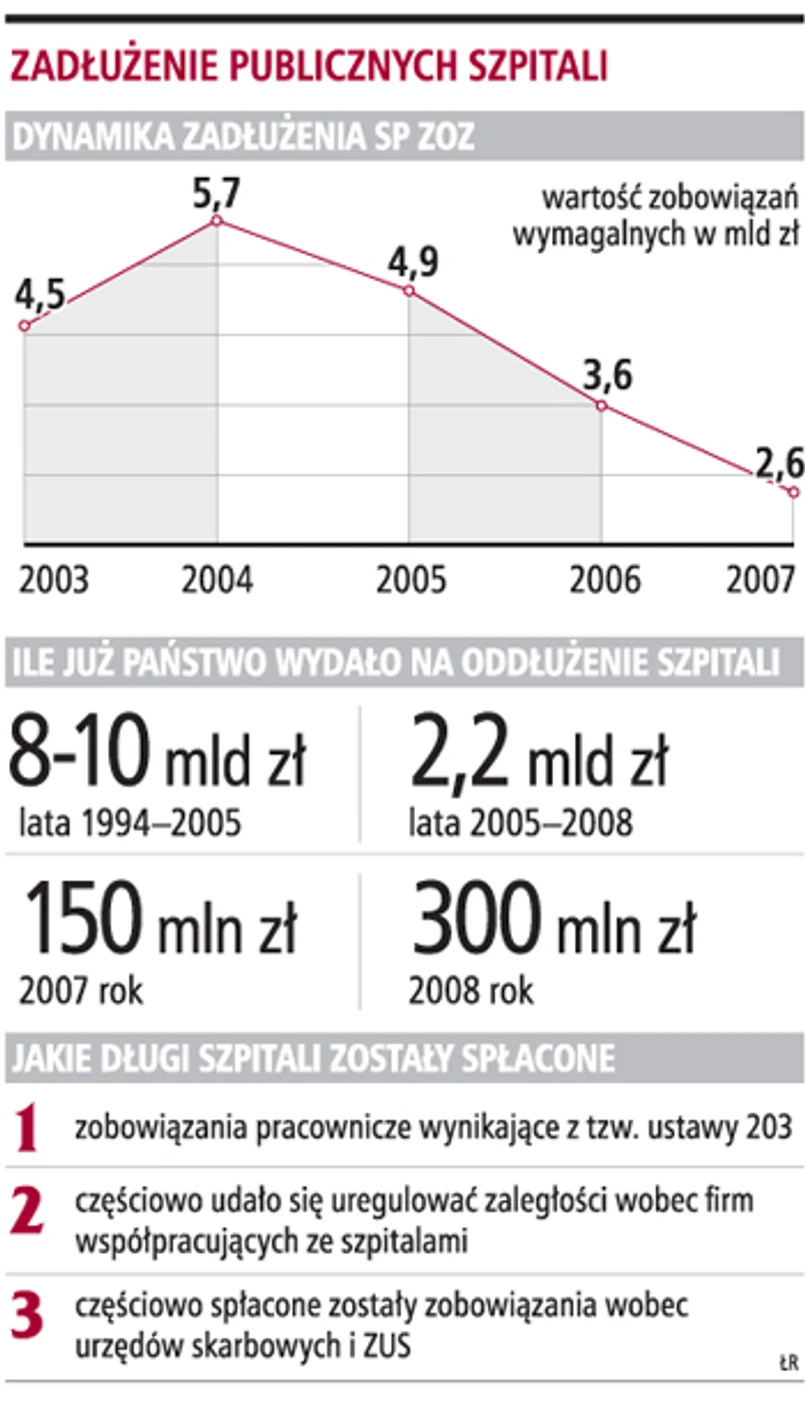 Szacuje się, że na spłatę tylko zobowiązań wymagalnych, czyli takich, których termin płatności już minął, trzeba będzie przeznaczyć 4-5 mld zł. Drugie tyle będzie kosztować spłata pozostałych zobowiązań szpitali.