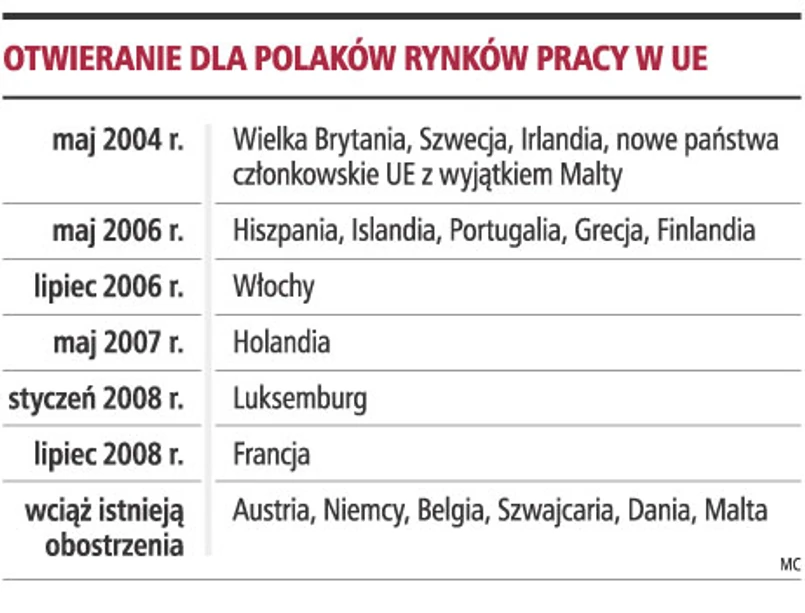 Jeszcze tylko Niemcy, Belgia, Dania, Austria, Malta i Szwajcaria nie otworzyła rynków pracy dla pracowników z krajów nowej Unii. Zapowiadają korzystanie z okresów przejściowych w stosowaniu unijnej swobody przepływu pracowników do 2011 roku.