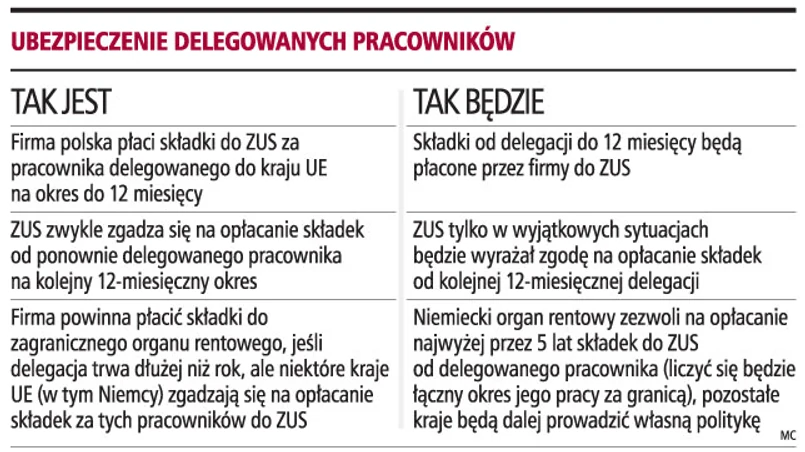 Politykę wobec pracowników delegowanych zmienia też niemiecki organ rentowy DVKA, który zezwoli na ubezpieczenie pracownika w Polsce najwyżej przez pięć lat, sumując wszystkie okresy jego zatrudnienia w Niemczech. Później trzeba będzie płacić niemieckie, wyższe składki. Zdaniem przedsiębiorców zwiększy to koszty prowadzonej działalności i wymusi większą rotację pracowników.