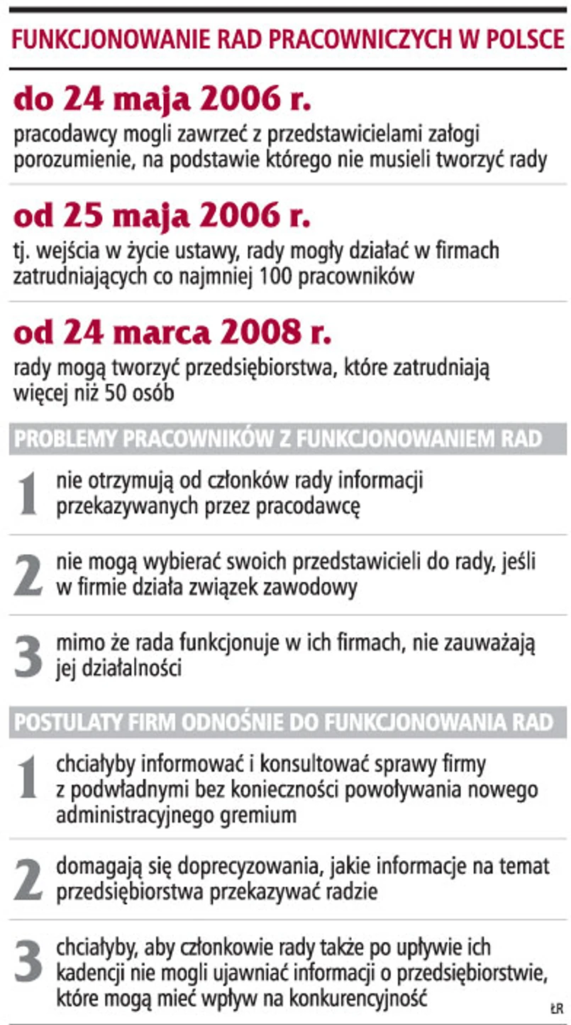 W jej przekonaniu rada nie przyczyniła się do lepszego przepływu informacji o firmie. Członkowie tego gremium zostali zobowiązani przez pracodawcę do nieujawniania niektórych informacji reszcie załogi. Rzadko występują też o udostępnienie aktualnych danych o firmie. Pracodawca z kolei przestał informować wszystkich, co się dzieje w przedsiębiorstwach. Jak podkreśla Marcin Wojewódka, radca prawny z kancelarii Wojewódka & Pabisiak, ustawa była opracowywana w ogromnym pośpiechu, aby uniknąć finansowej kary za opóźnienia w implementacji unijnej dyrektywy. Stąd tak wiele w niej niedopracowanych regulacji.