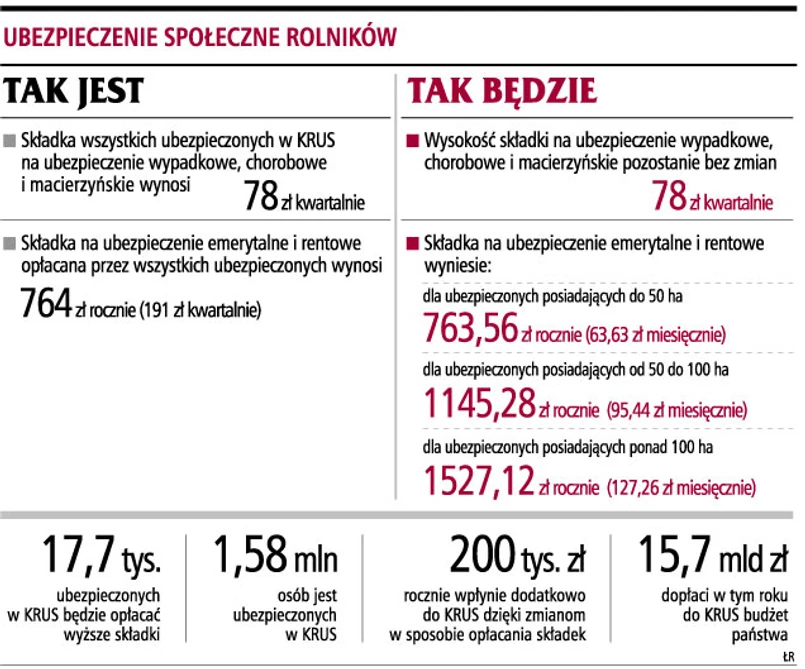 Zmianie nie ulegnie wysokość drugiej składki. Wbrew wcześniejszym zapowiedziom podobnie będzie też ze składką emerytalno-rentową. Rząd chce, aby pozostała na niezmienionym poziomie niemal dla wszystkich rolników. Wyniesie od stycznia 63,63 zł miesięcznie, czyli rocznie dokładnie tyle samo co obecnie (763,56 zł). Obejmie tych rolników, którzy posiadają gospodarstwa do 50 hektarów. W efekcie będzie ją opłacać 1,56 mln osób ubezpieczonych w KRUS (99 proc.).