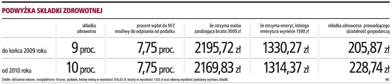 Zapowiadana przez rząd na 2010 rok podwyżka składki zdrowotnej spowoduje obniżenie średniej płacy netto o prawie 26 zł. Osoby prowadzące własne firmy zapłacą rocznie do ZUS prawie 300 zł więcej. Przeciętny emeryt otrzyma w styczniu 2010 r., w porównaniu z grudniem 2009 r., 16 zł mniej.