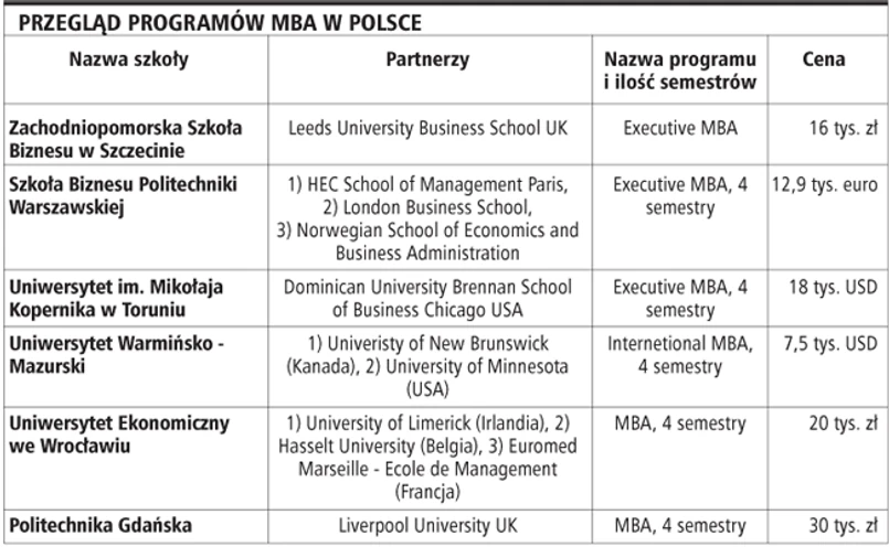 Dla większości szkół dobra koniunktura w ostatnich latach, a przedtem przystąpienie Polski do Unii Europejskiej i integracja polskiej gospodarki z rynkami europejskimi były czynnikami, które spowodowały wzrost zainteresowania programami MBA. Trzeba jednak znaleźć wśród wielu ofert tę odpowiednią. Należy sprawdzić, czy dany program odpowiada oczekiwaniom kandydata i wychodzi naprzeciw potrzebom rynku. Uczelnie nawiązują współpracę z ośrodkami zagranicznymi, które mają duże doświadczenie w prowadzeniu tego typu edukacji m.in. po to, by sprostać potrzebom.
