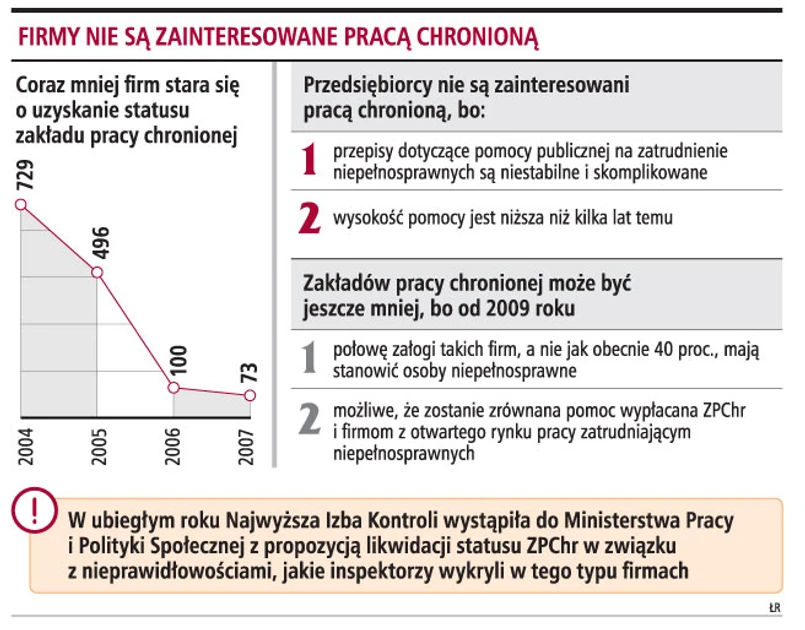 W 2007 roku o status zakładu pracy chronionej ubiegało się tylko 73 pracodawców. To o 656 mniej niż trzy lata wcześniej. Od 2004 roku 443 firmy posiadające status ZPChr straciły go lub z niego zrezygnowały. Firmy nie są zainteresowane pracą chronioną, bo publiczna pomoc wypłacana im na zatrudnienie niepełnosprawnych jest niższa niż kilka lat temu. Dodatkowo procedura ubiegania się o takie wsparcie wciąż się zmienia i jest bardzo skomplikowana.