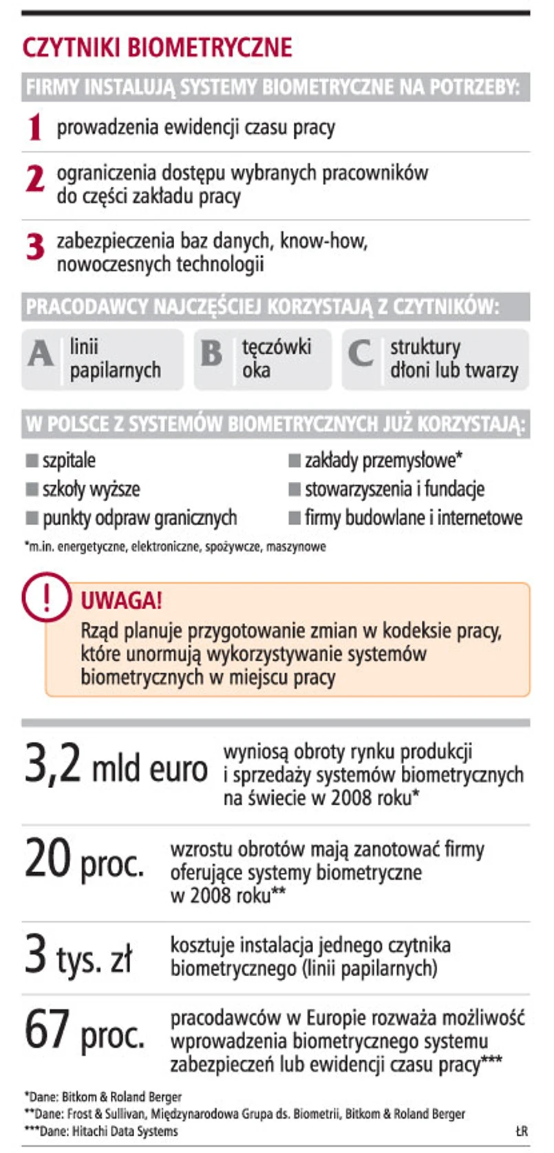 Coraz więcej polskich firm wprowadza biometryczne systemy kontroli czasu pracy podwładnych lub ogranicza w ten sposób dostęp niektórym z nich do pomieszczeń i baz danych firmy. Stosują je już m.in. szpitale, szkoły wyższe czy zakłady przemysłowe. Tak wynika z sondy GP przeprowadzonej wśród firm oferujących instalację tego typu systemów. Z prognozy niemieckiej firmy Bitkom & Roland Berger wynika, że w 2008 roku obroty na rynku systemów biometrycznych osiągną na świecie 3,2 mld euro. W najbliższych latach sprzedaż tych systemów ma wzrastać co roku o około 20 proc.