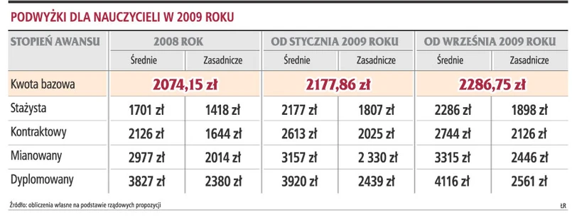 Obecnie kwota bazowa dla nauczycieli wynosi 2074,15 zł. Od stycznia 2009 r. wzrośnie do 2177,86 zł, a od września do 2286,75 zł. Oznacza to, że będzie wyższa o nieco ponad 10 proc. A od jej wysokości zależą średnie