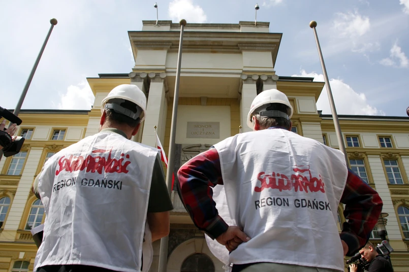 Protestujący w Warszawie związkowcy ze Stoczni Gdańsk odczytali przed kancelarią prezydenta na ul. Wiejskiej petycję do Lecha Kaczyńskiego, by ten przyjrzał się ich sytuacji i całemu przemysłowi stoczniowemu.