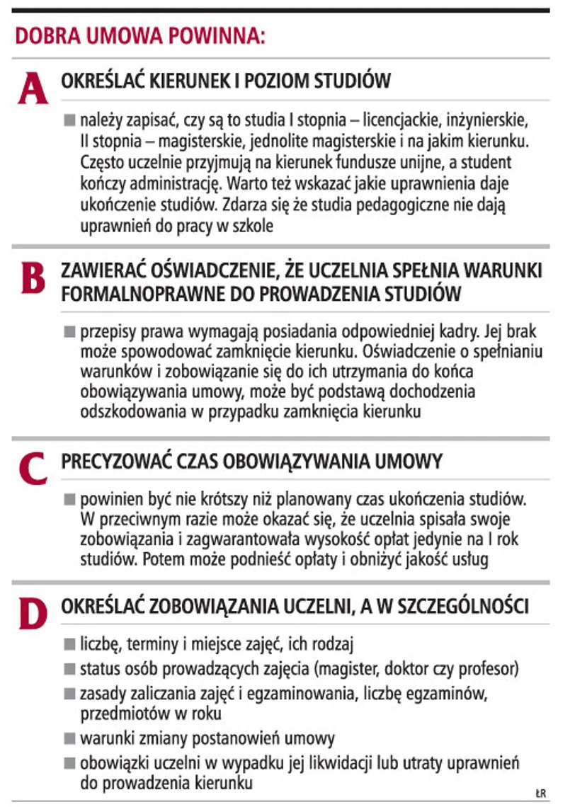 Od września 2006 r. uczelnie muszą zawierać pisemne umowy z osobami rozpoczynającymi naukę na studiach niestacjonarnych. Przed ich podpisaniem warto sprawdzić, czy nie ma w nich tzw. klauzul zakazanych.